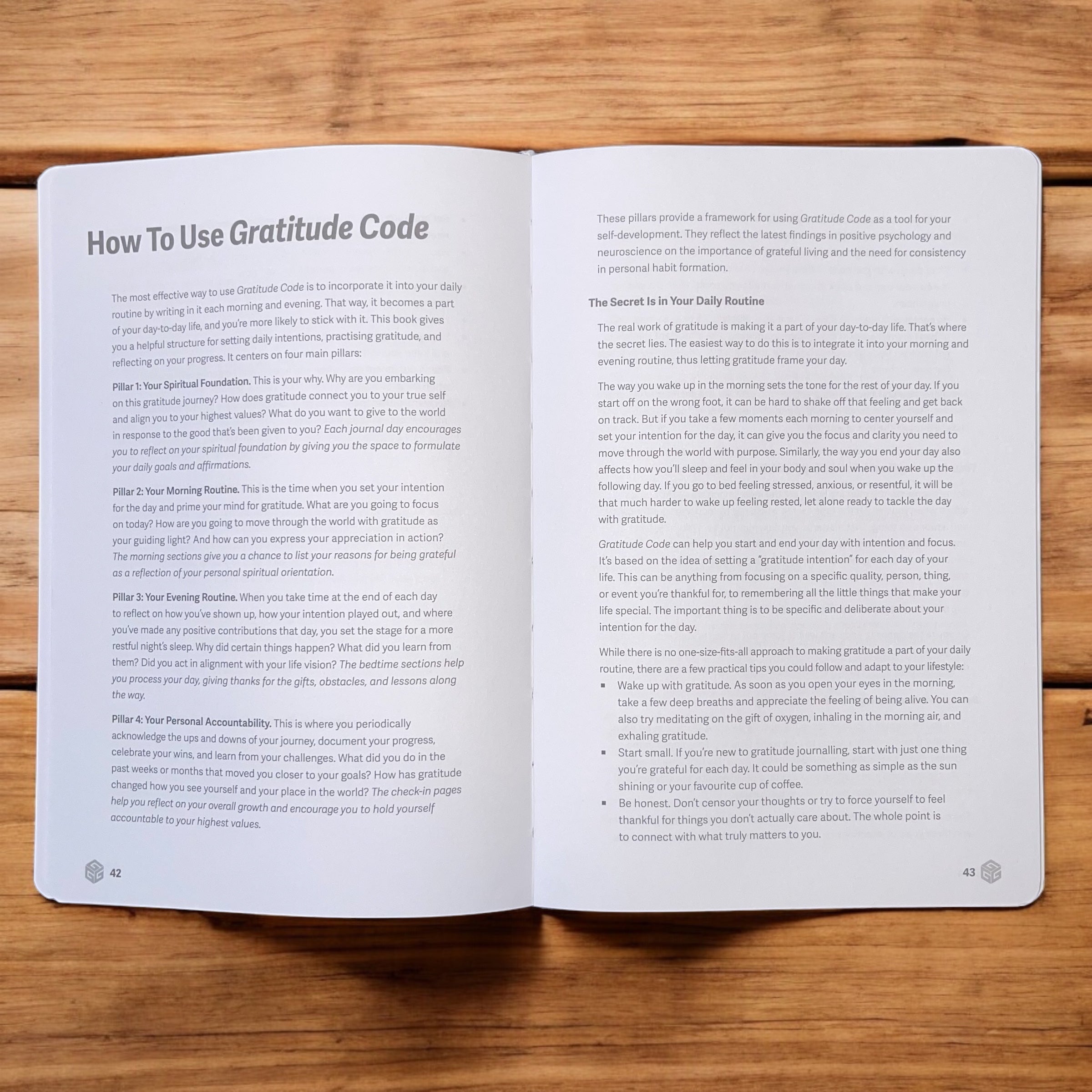 Elevate your daily reflections with the GCODE Journal, a premium tool designed to cultivate gratitude and personal growth. Backed by PhD-level research, this journal offers a scientific introduction to the benefits of gratitude and writing, guiding you through a step-by-step process to harness these advantages.